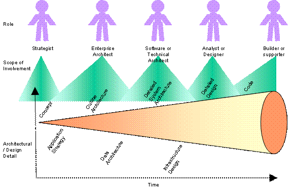 Finally, people change over time. As a person's interests and skills develop, he or she may feel happier concentrating on different parts of a system's life-cycle. If an architect has particular skill explaining concepts to business people, he will naturally focus at the strategic end. Another with deep technical skills will focus at greater levels of detail.